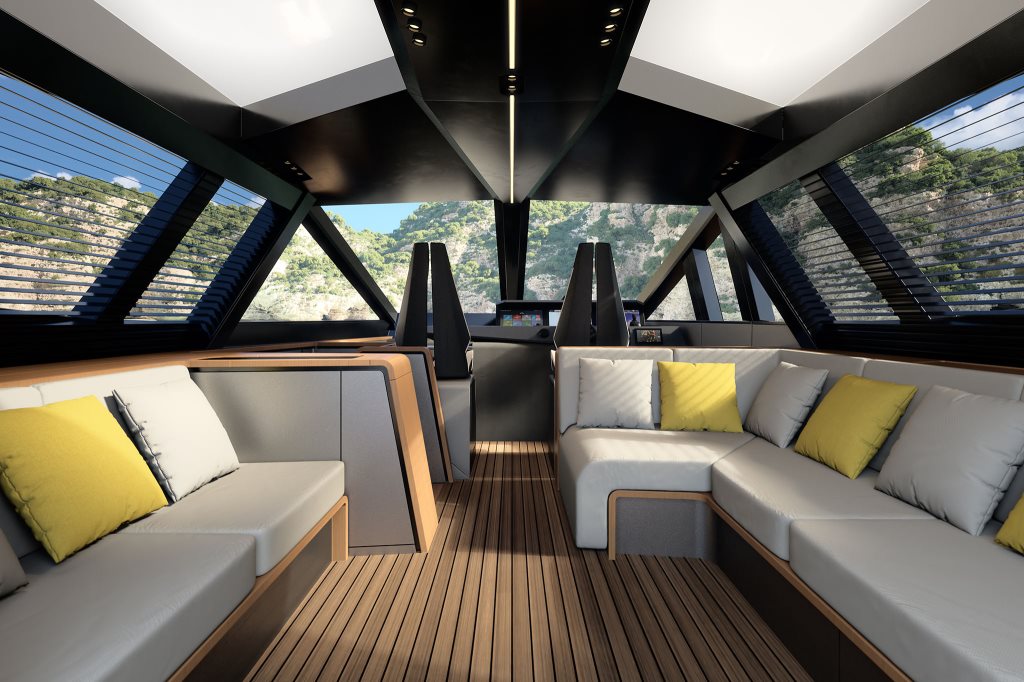 Sliding glass doors lead into the dining area and on to the interior salon.