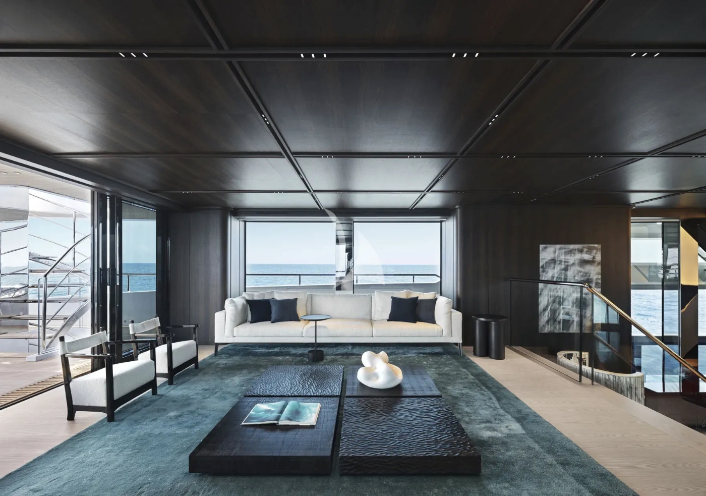 The impressive additional volume – with up to 3.5m headspace in areas - achieved by the horizontal positioning of the engine room creates a unique split-level layout with a glass-sided staircase which transports guests from the ‘ocean lounge’ and spa up to the main deck salon, central dining area and upper deck salon.