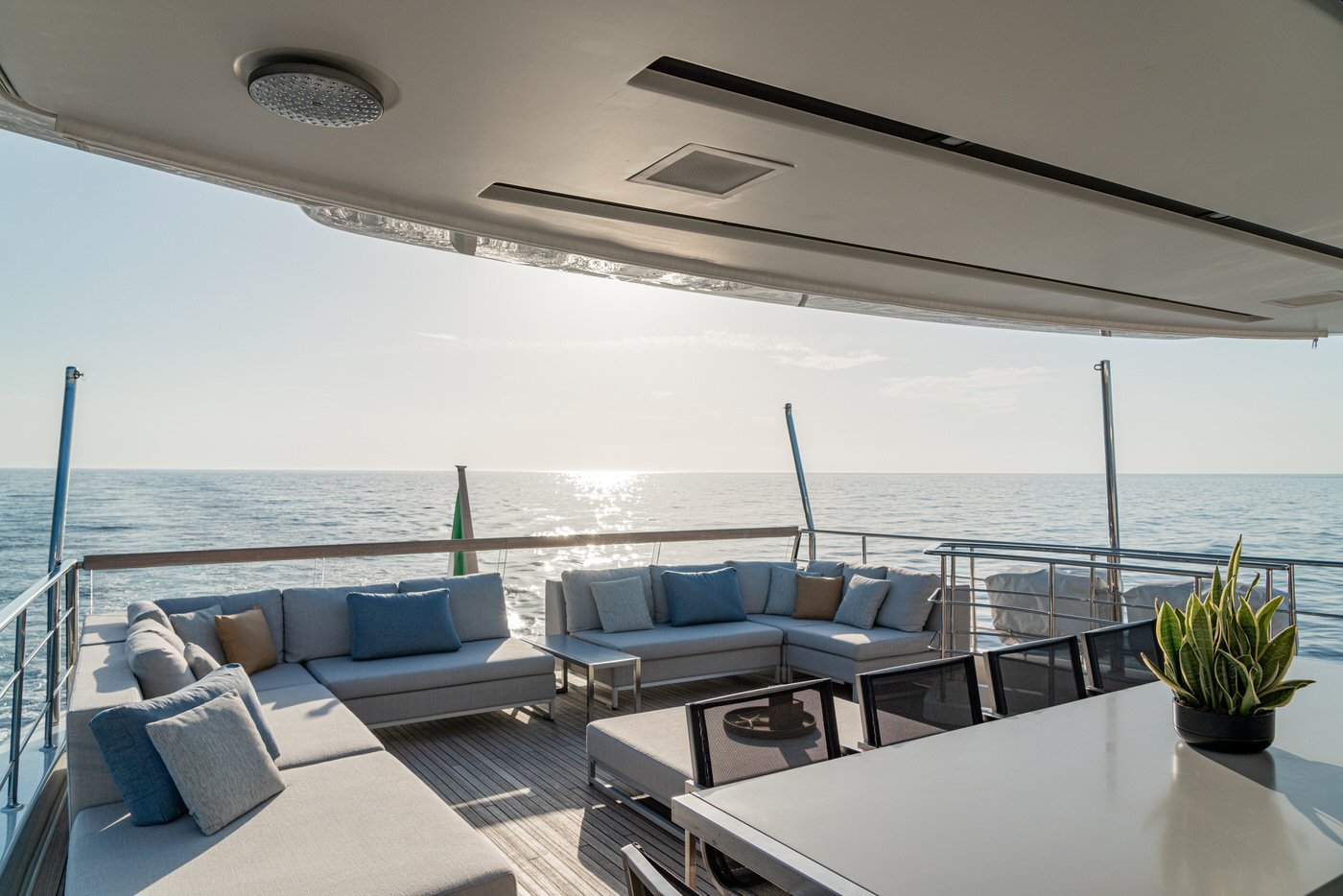 The fabulous sun deck is zoned with modular lounge seating aft, al fresco dining and bar amidships and the helm controls forward.