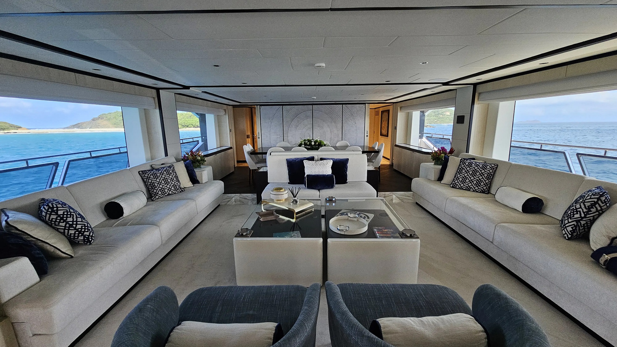From the cockpit there is direct access into the main salon and down to the swim platform which opens into a beach club when the transom door is opened.
