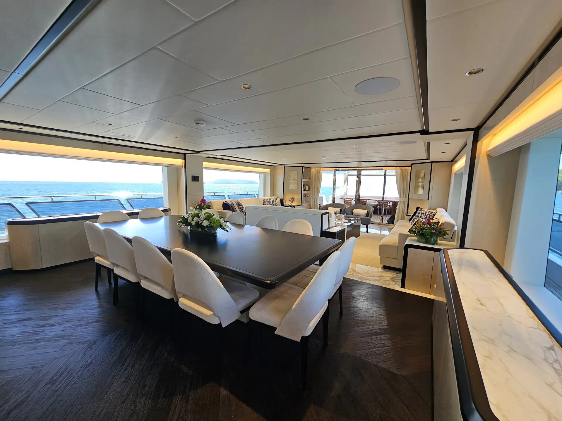 From the cockpit there is direct access into the main salon and down to the swim platform which opens into a beach club when the transom door is opened.