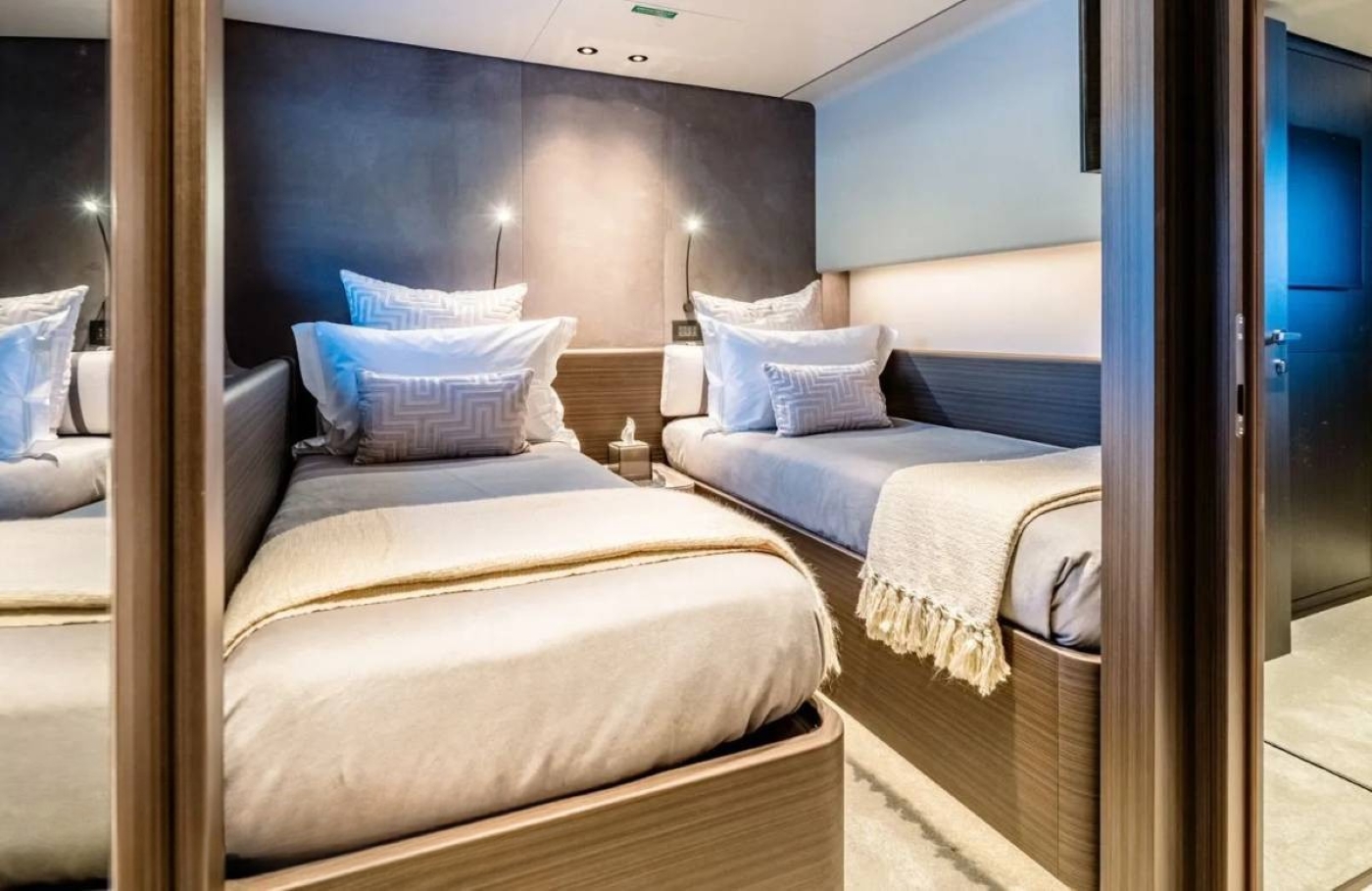 She features an ambitious volume with a timeless aesthetic and forward-thinking styling across her ambitious volume. She can accommodate up to 10 guests in five suites with three additional crew cabins for a crew of 6.