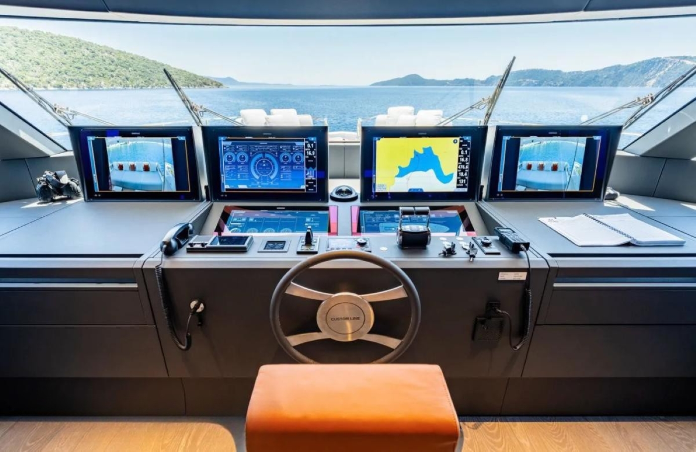 Motor yacht AT ONE is a 28.43m (93'2") Custom Line Navetta 30 from Ferretti Group Engineering, ACPV Architects and Custom Line Atelier launched in 2024. She features an ambitious volume with a timeless aesthetic and forward-thinking styling across her ambitious volume.