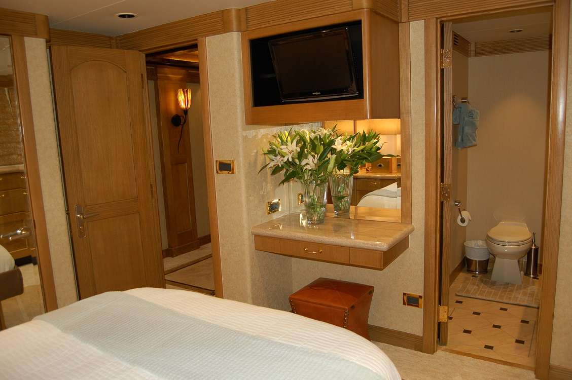 Forward & down is a VIP suite with ensuite bath. The lower deck accessed through the staircase just aft of the galley, offers two guest suites aft and the master forward, all with ensuite baths. The crew is below and aft for ...