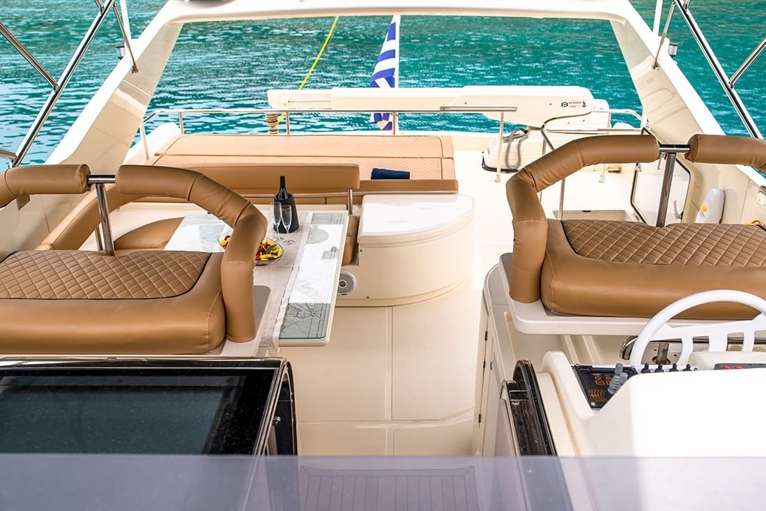 The open sun deck is fitted with a wide aft sun pad, a dining banquette and helm controls plus companions seating forward.