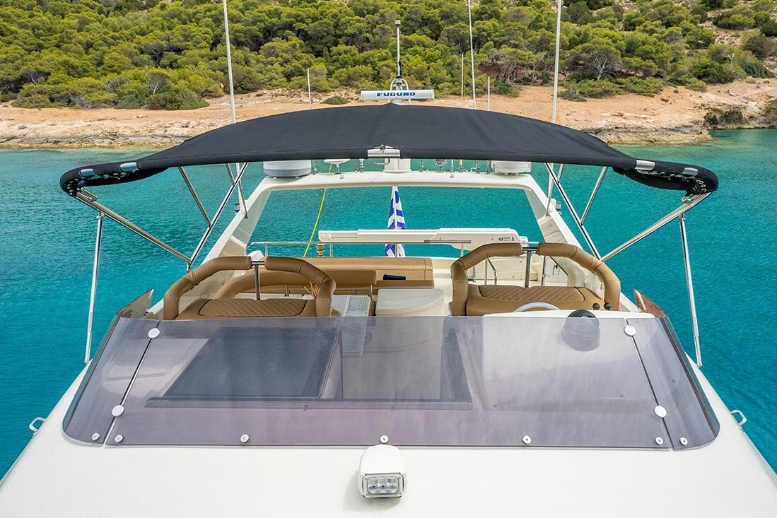 The open sun deck is fitted with a wide aft sun pad, a dining banquette and helm controls plus companions seating forward.