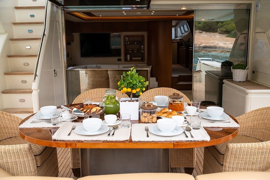 The open sun deck is fitted with a wide aft sun pad, a dining banquette and helm controls plus companions seating forward.