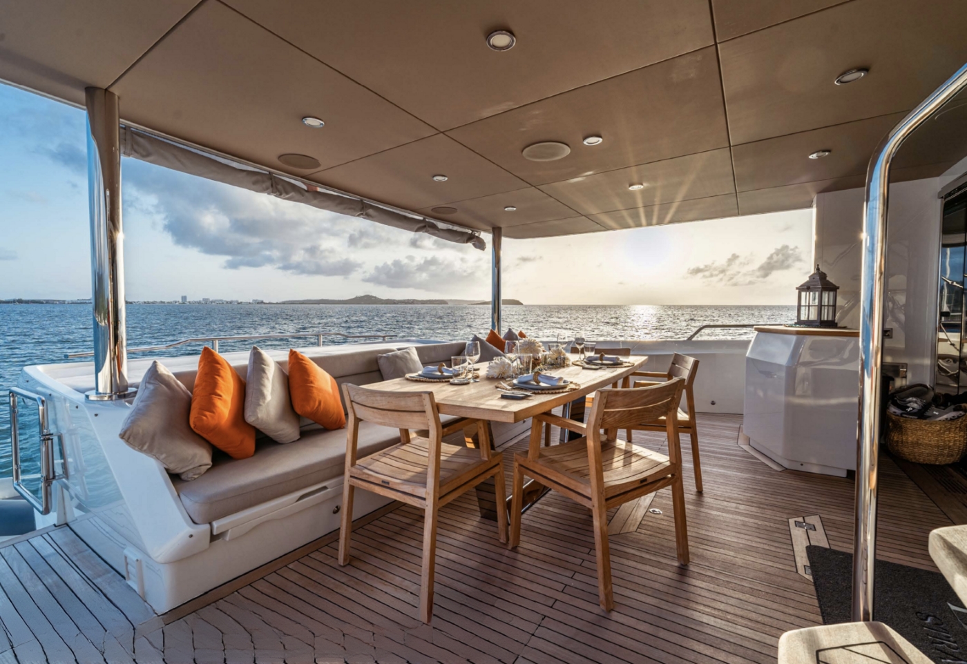 The beautiful sundeck features a square dining table with moveable chairs, a lounge area with sofas and a coffee table and two sun pads with adjustable headrests.