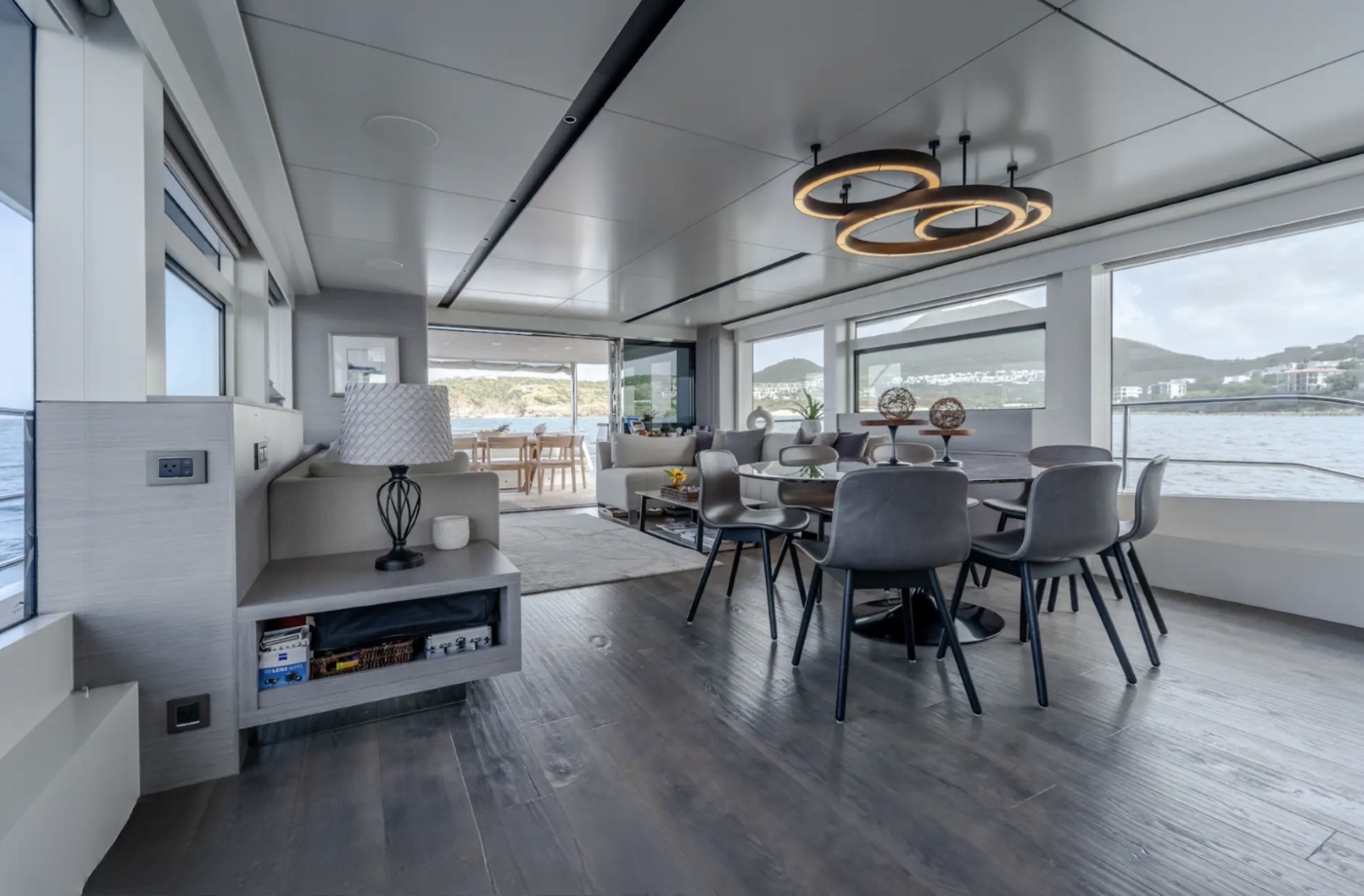 The beautiful sundeck features a square dining table with moveable chairs, a lounge area with sofas and a coffee table and two sun pads with adjustable headrests.