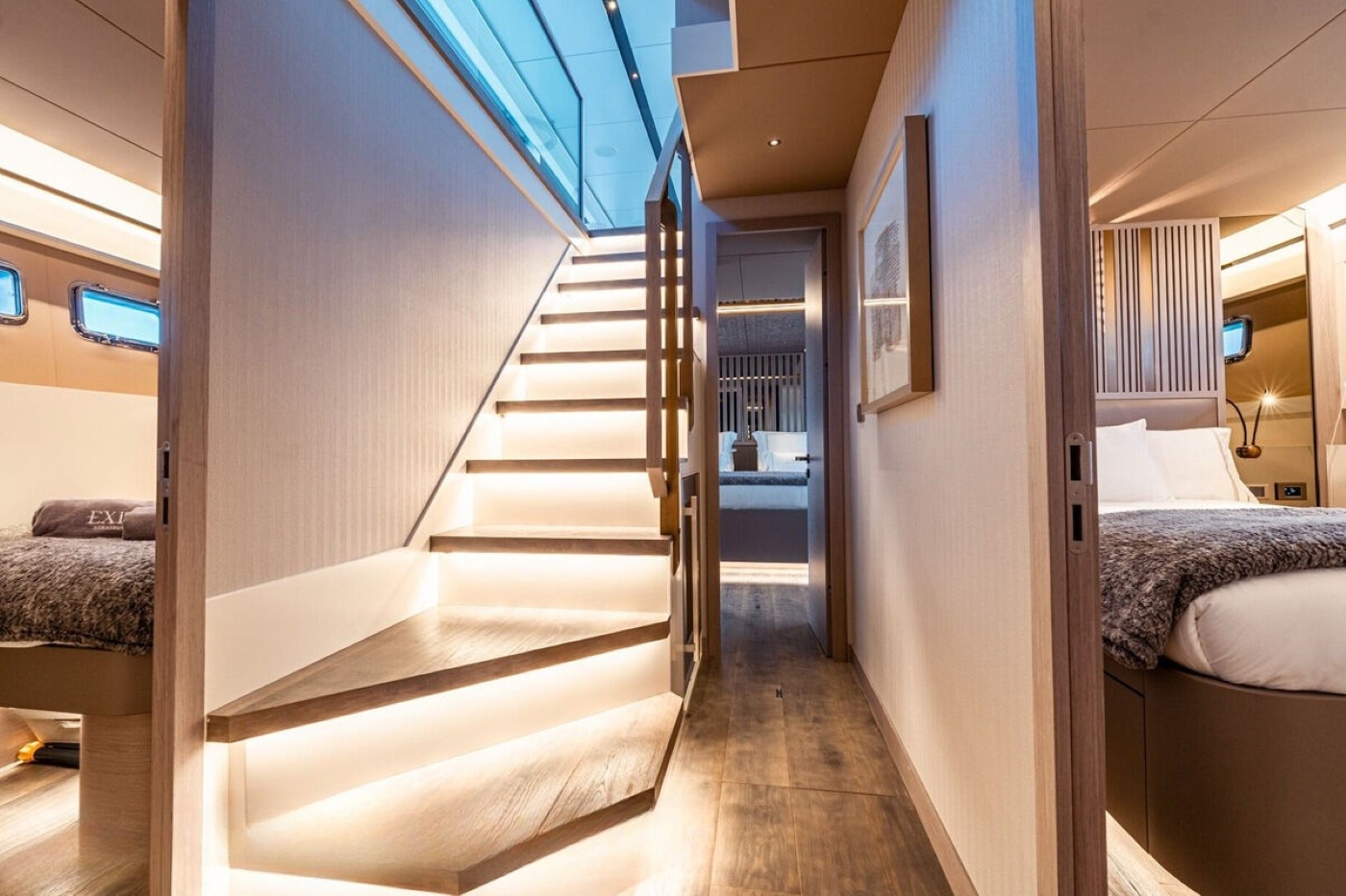 The four comfortable guest suites are on the lower deck and configured as a substantial master suite, forward VIP, a double to port and twin to starboard. Decorated in warm neutral shades, the spaces are welcoming and well furnished. The full beam master boasts a walk-in-wardrobe, lounge space, vanity/desk and ensuite.