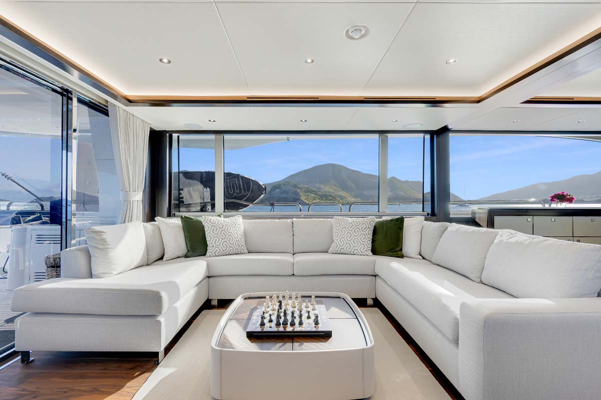 The main salon is configured with a plush, oversized modular sofa and occasional chairs surrounding a coffee table and a forward dining setting. There are large panoramic windows plus sliding glass doors onto the main deck aft and starboard gangway. Amidships is the well-equipped galley and a convenient day head off the lobby.