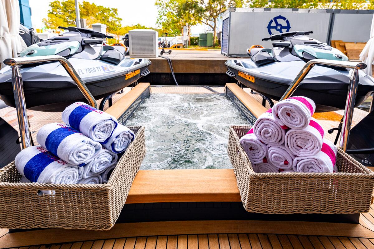 On the bridge deck there is another dining setting, plus a wraparound sofa hugging the bulwarks – great views of the surroundings on all sides in comfort! On the main deck aft is a lounge space idea for pre-dinner drinks and steps down to the extended swim platform with includes the second pool, an inflatable dock and bimini shades.