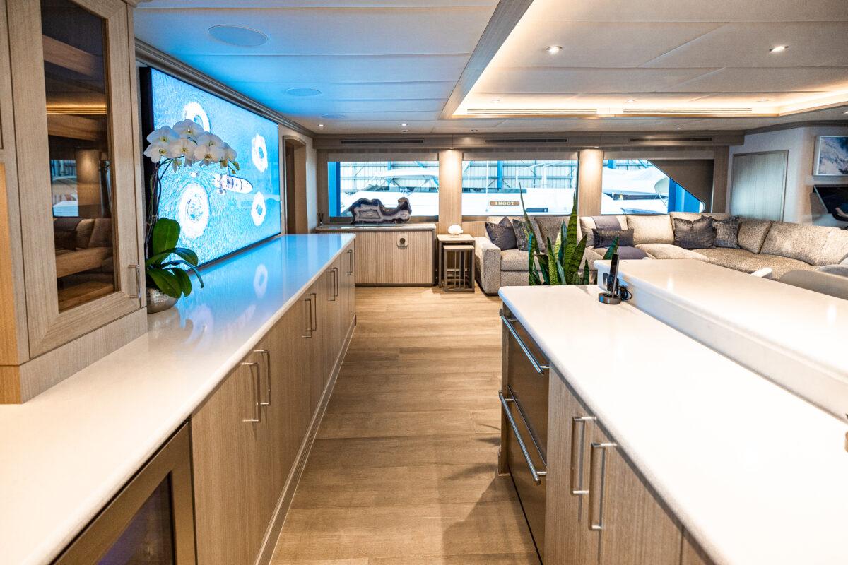 On the bridge deck there is another dining setting, plus a wraparound sofa hugging the bulwarks – great views of the surroundings on all sides in comfort! On the main deck aft is a lounge space idea for pre-dinner drinks and steps down to the extended swim platform with includes the second pool, an inflatable dock and bimini shades.