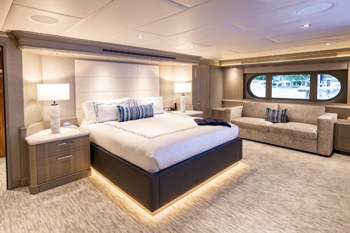 The master suite is forward on the main deck and includes a king-sized berth, lounge area and beautiful ensuite. The additional five suites are all king sized – with two convertible to twins – with luxurious and private ensuite bathrooms.