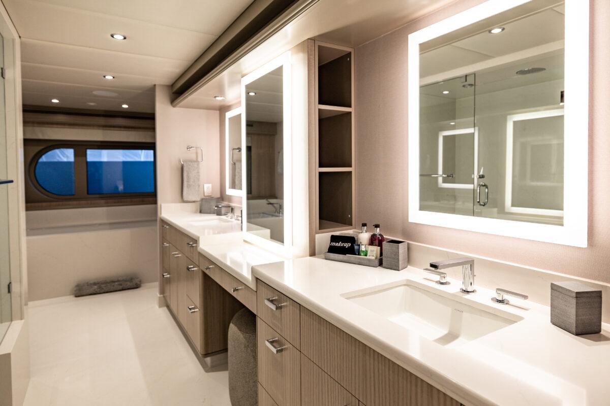 The master suite is forward on the main deck and includes a king-sized berth, lounge area and beautiful ensuite. The additional five suites are all king sized – with two convertible to twins – with luxurious and private ensuite bathrooms.