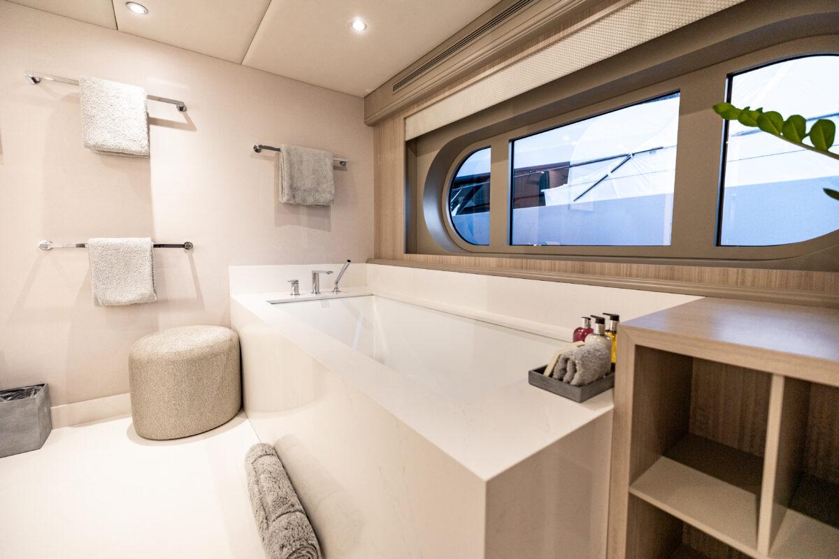 The master suite is forward on the main deck and includes a king-sized berth, lounge area and beautiful ensuite. The additional five suites are all king sized – with two convertible to twins – with luxurious and private ensuite bathrooms.