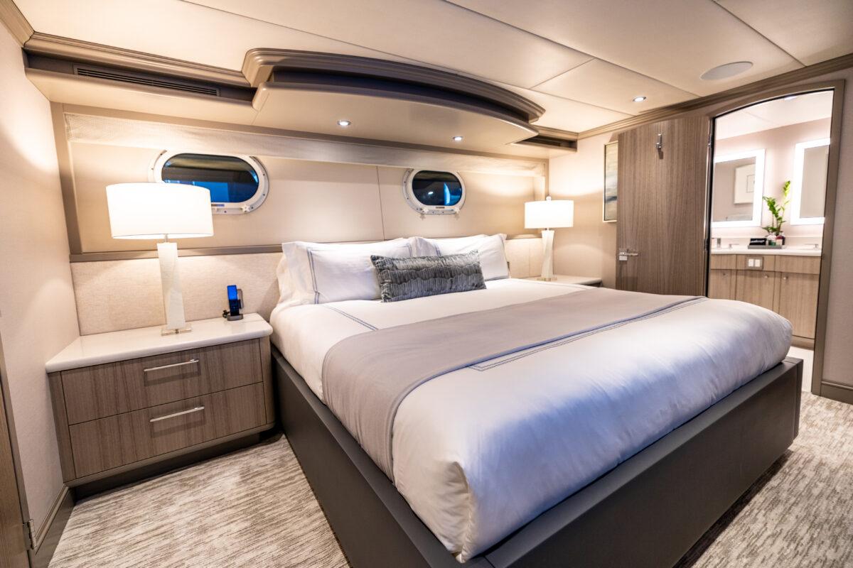 The master suite is forward on the main deck and includes a king-sized berth, lounge area and beautiful ensuite. The additional five suites are all king sized – with two convertible to twins – with luxurious and private ensuite bathrooms.