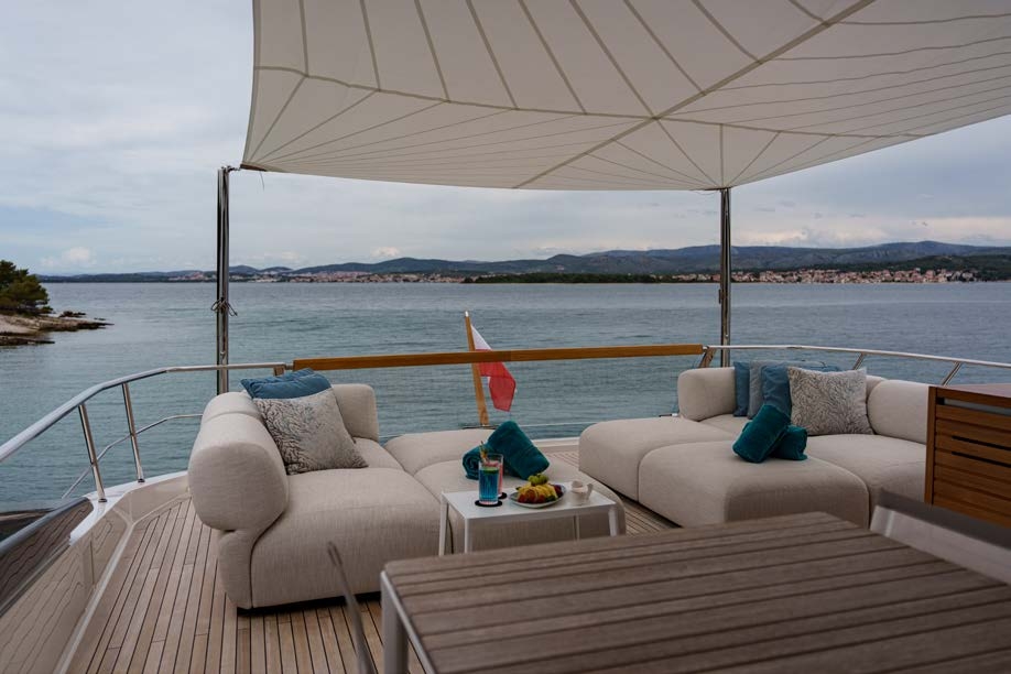 Expansive decks, both forward and aft, offer ample space for relaxation and entertainment under the sun or in the shade.