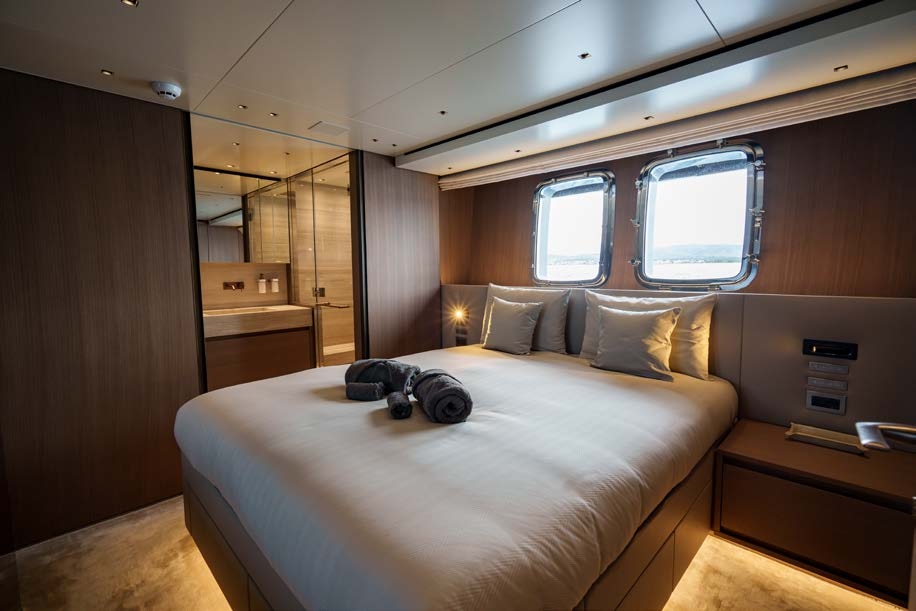 She can accommodate up to 11 guests in five suites plus additional cabins for four crew members.