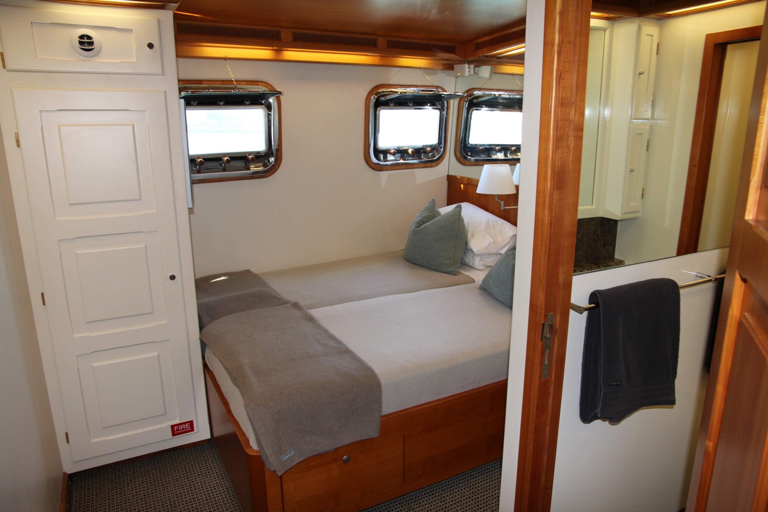 She can accommodate up to 12 guests in 7-cabins: 1 king master; 2 queens; 2 queens that can convert to twins; and 2 single cabins ... that’s 1 king, 4 queens, 2 singles if desired /or 1 king, 2 queens and 6 singles