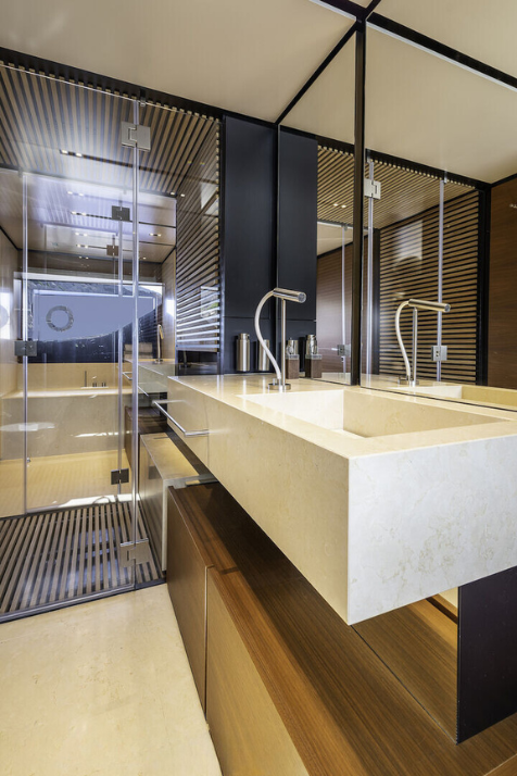 The four additional suites on the lower deck are configured as two doubles, a convertible double/twin and a twin with additional pullman bunk. All the suites benefit from the luxury and privacy of ensuite bathroom facilities.