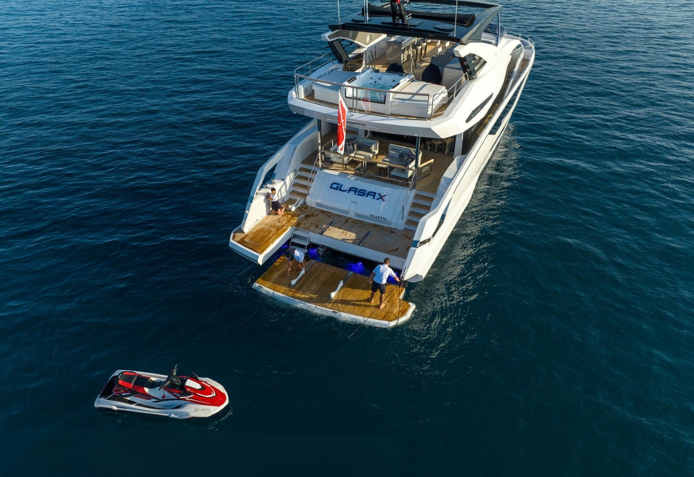 Luxury yacht GLASAX is a 27.10 m (88' 11") Sunseeker 90 Ocean flybridge yacht built in 2022 with innovative deck arrangements which include premium charter features. Her elegant interior is warm and inviting with accommodation ...