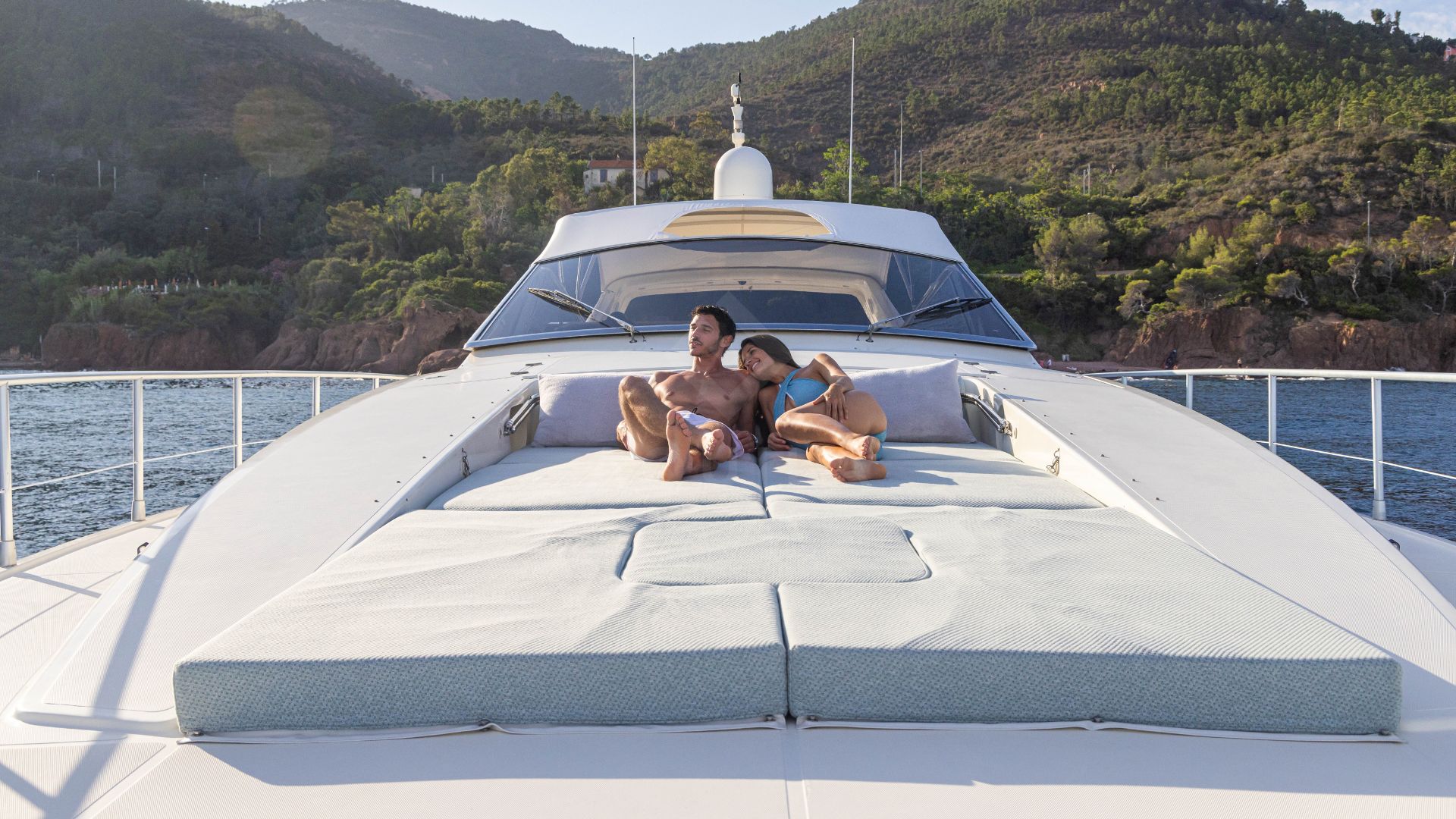 Access around to the foredeck reveals another set of built-in sun pads, this time facing forward, and benefitting from a retractable canopy shade.