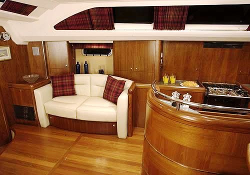 Her salon includes a dining area for 6 guests, a small lounge, a flat screen TV, VCR and hi-fi system.