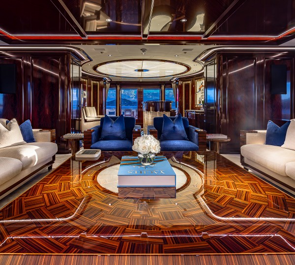 On the upper deck there is a luxury jacuzzi, set into an arrangement of sun pads on the foredeck and a sociable u-shaped sofa and occasional tables on the aft deck. On the main deck aft guests can relax under the overhang and enjoy drinks or dinner al fresco.