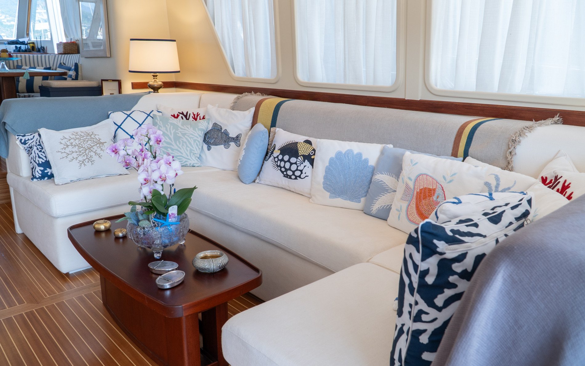 The main salon is set up with convivial seating arrangements for guests with a u-shaped sofa surrounding a coffee table with a two-seater sofa opposite and stairs down. Forward is a dining banquette adjacent to the galley, while further forward is the main helm station and port side steps down to the lower deck.