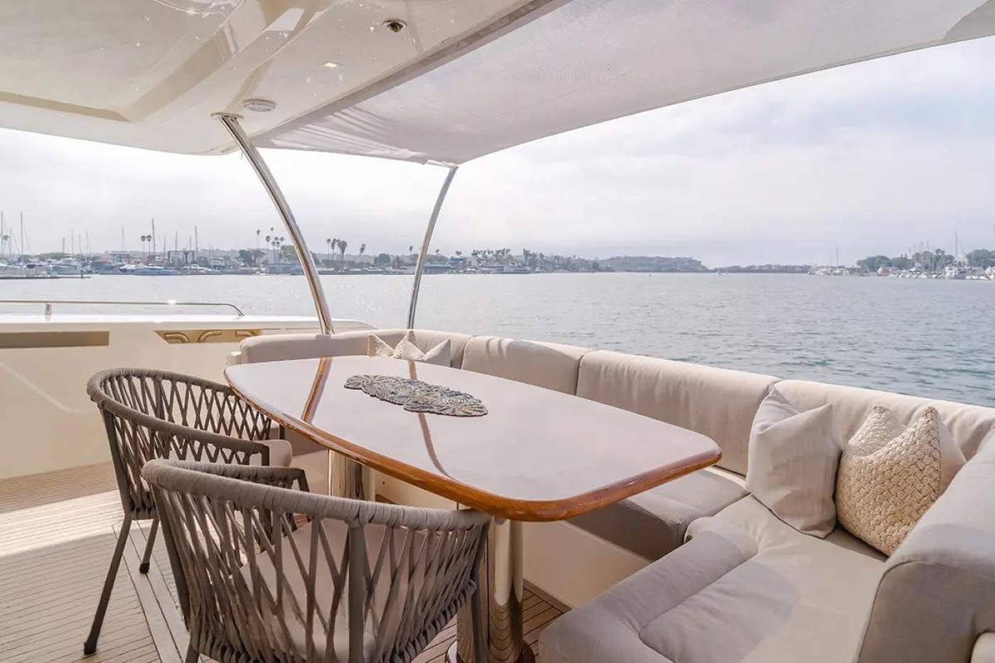 The main sociable space on board is the sun deck where a sheltered dining setting and sit up bar are adjacent to the deck helm controls.