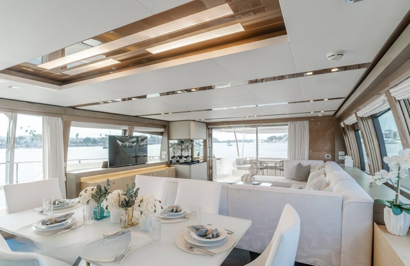 The main sociable space on board is the sun deck where a sheltered dining setting and sit up bar are adjacent to the deck helm controls.