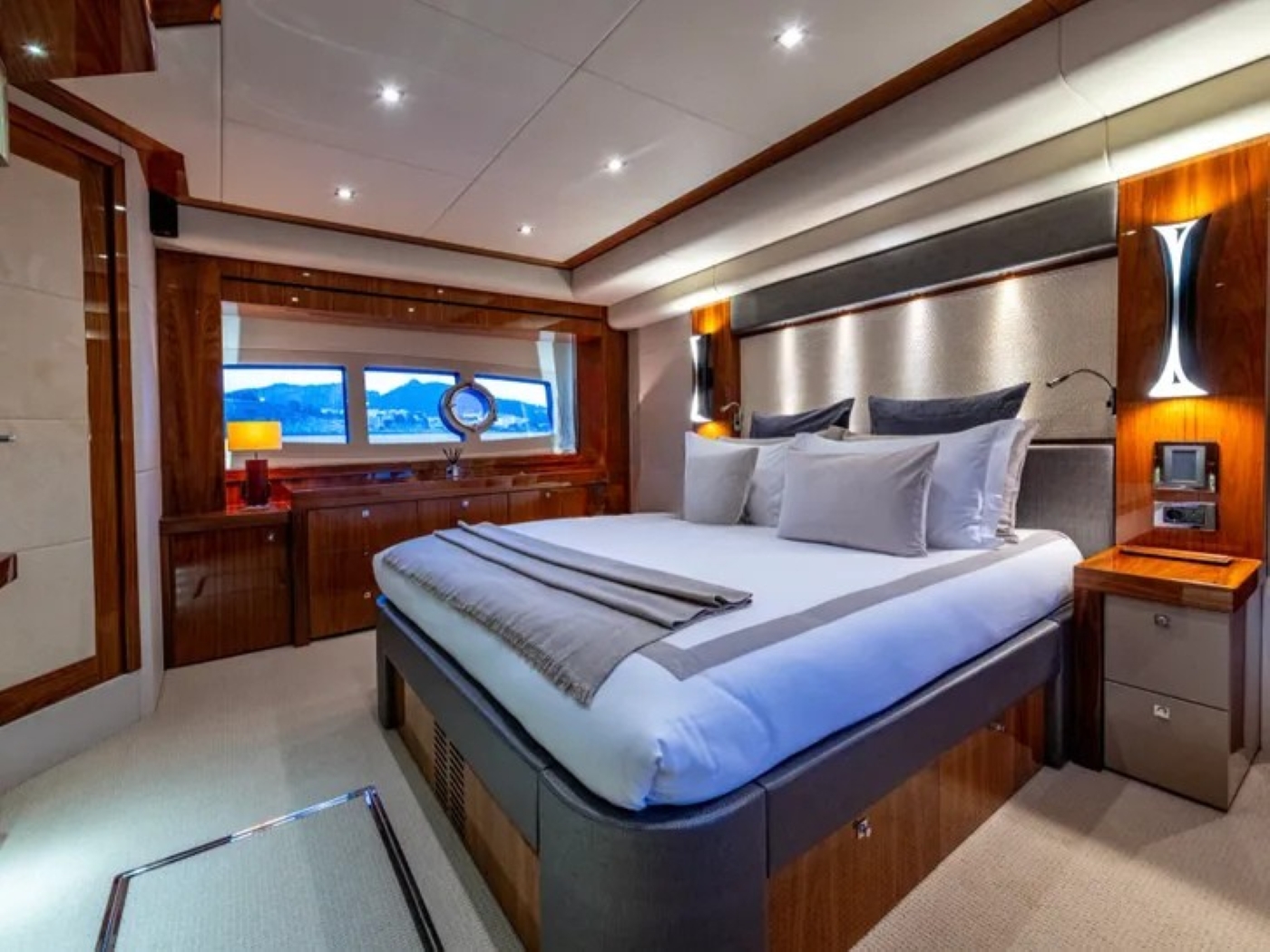 The main salon is arranged with a lounge aft and formal dining forward to starboard adjacent to sliding glass doors leading out the side deck. Elsewhere panoramic windows flood the space with light and offer tempting views of the surroundings.