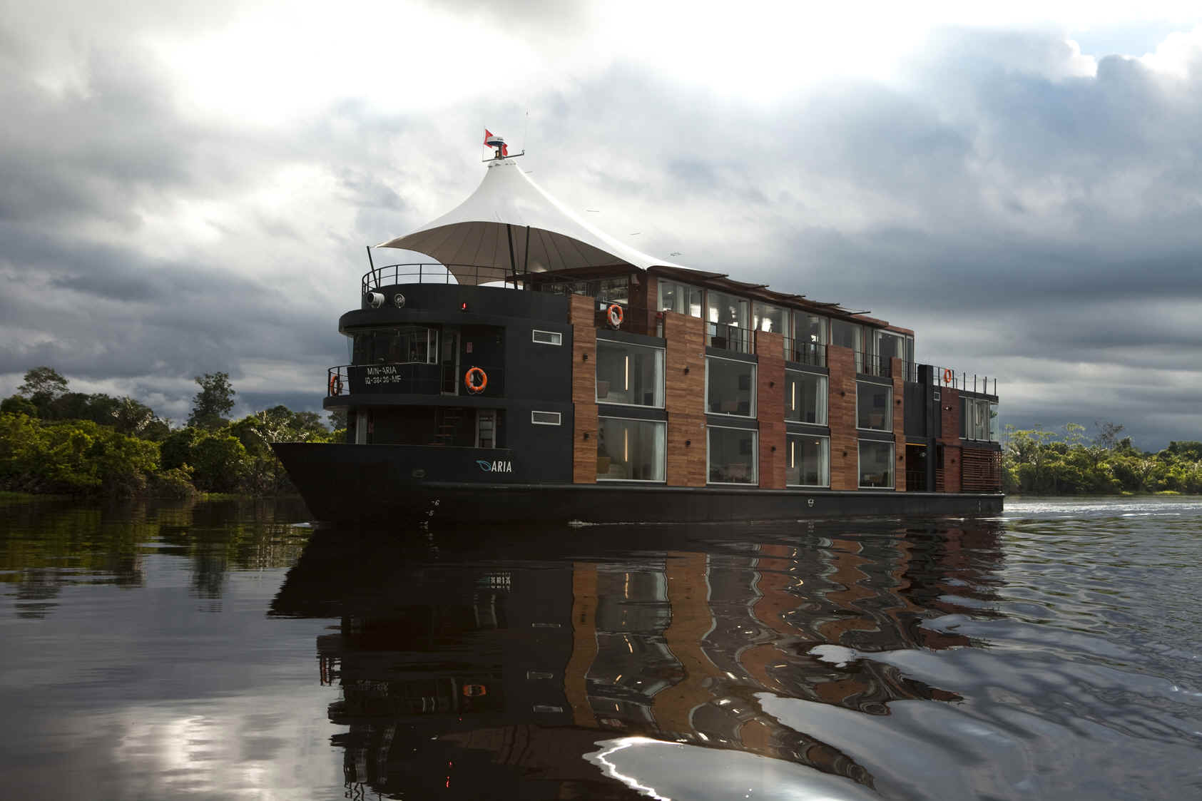 Each air-conditioned cabin has been beautifully decorated to create the feeling of a luxury lodge on the Amazon River, complete with Amazon photography by French photographer Jean Claude Constant. Sheets and bedspreads are 100% Peruvian cotton, with at least a 280-thread count.