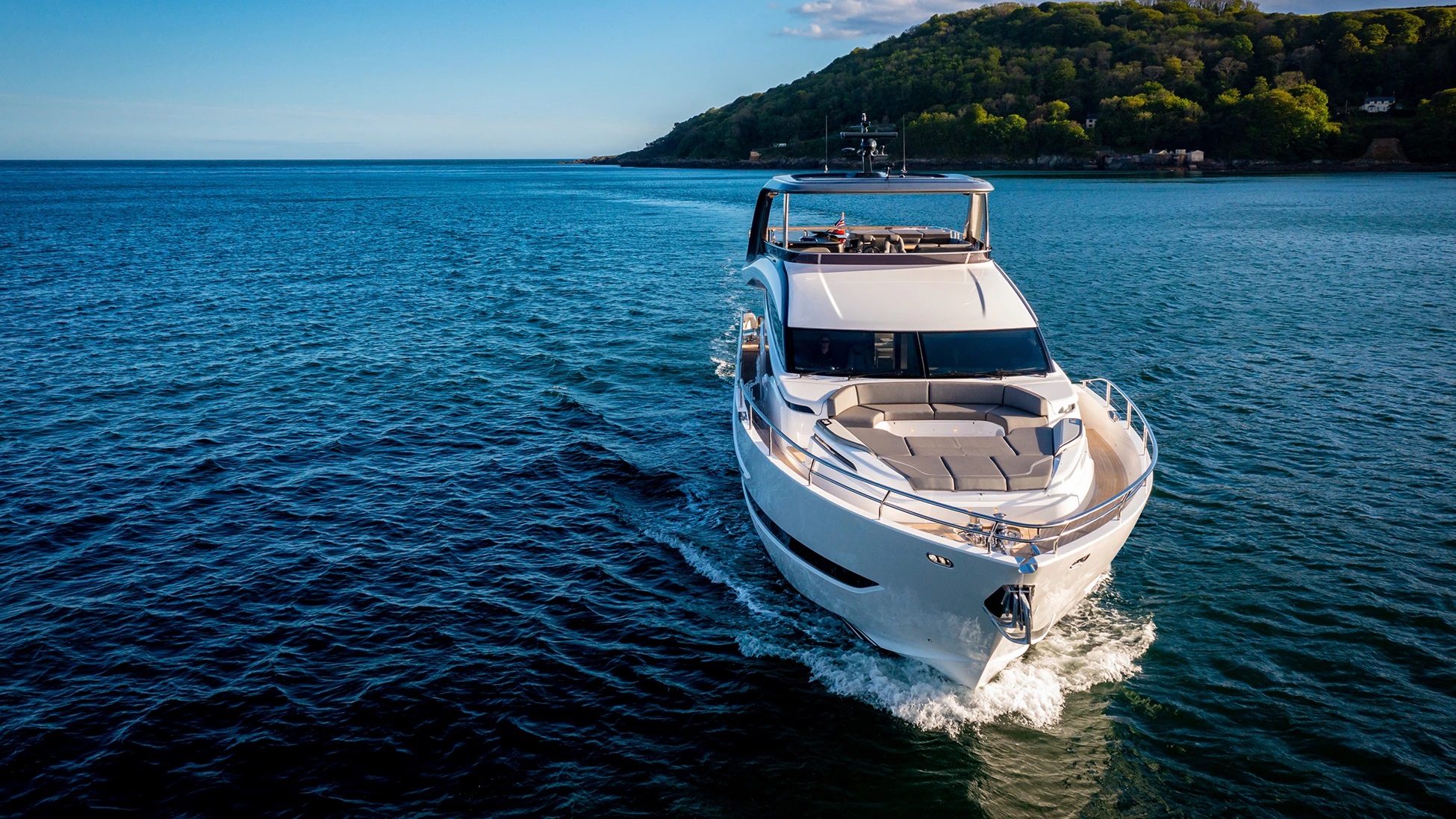 The wet bar and helm controls allow the crew to operate seamlessly on deck while guests relax on the double sun pad or on the lounge furniture aft.