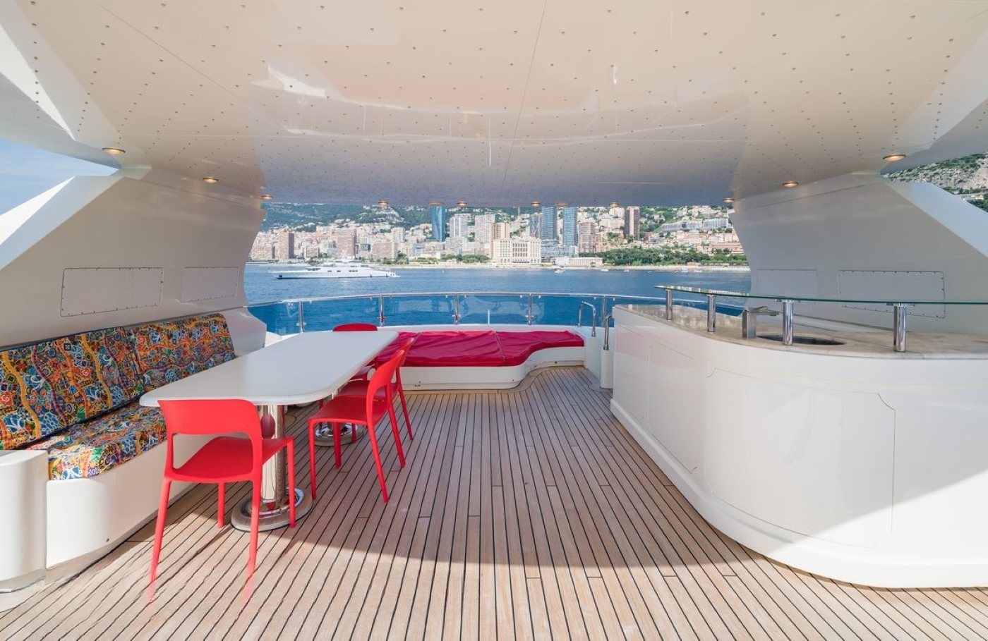 Under the hard roof a dining setting with corner sofa and moveable seating is to port and a wet bar is to starboard. Forward on the flybridge is a deck helm station and companion seating either side of steps leading down into the main wheelhouse.