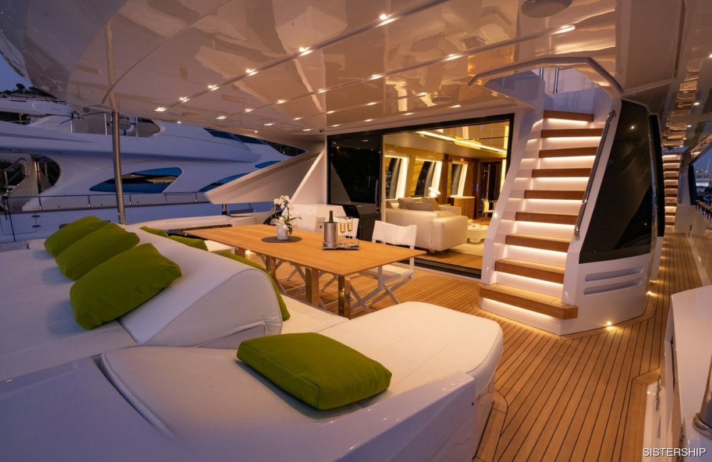 Under the hard roof a dining setting with corner sofa and moveable seating is to port and a wet bar is to starboard. Forward on the flybridge is a deck helm station and companion seating either side of steps leading down into the main wheelhouse.