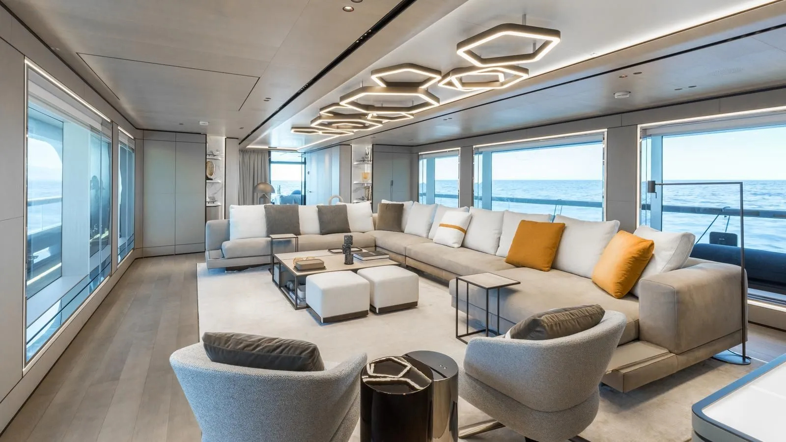 The aft upper deck salon is dedicated to dining and opens up on three sides to create a semi-al fresco experience. Occasional chairs and coffee tables complete the space, adding a choice of seating. Amidships on the upper deck there is a large private office for guests to use and forward is the wheelhouse and captain’s accommodation.