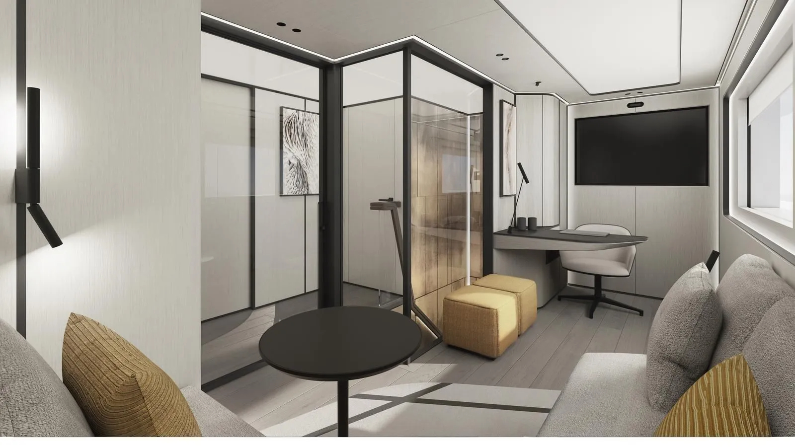 With dining moved to the sky lounge, the main salon becomes a sizeable lounge with generous modular sofas and occasional chairs with a convivial layout.