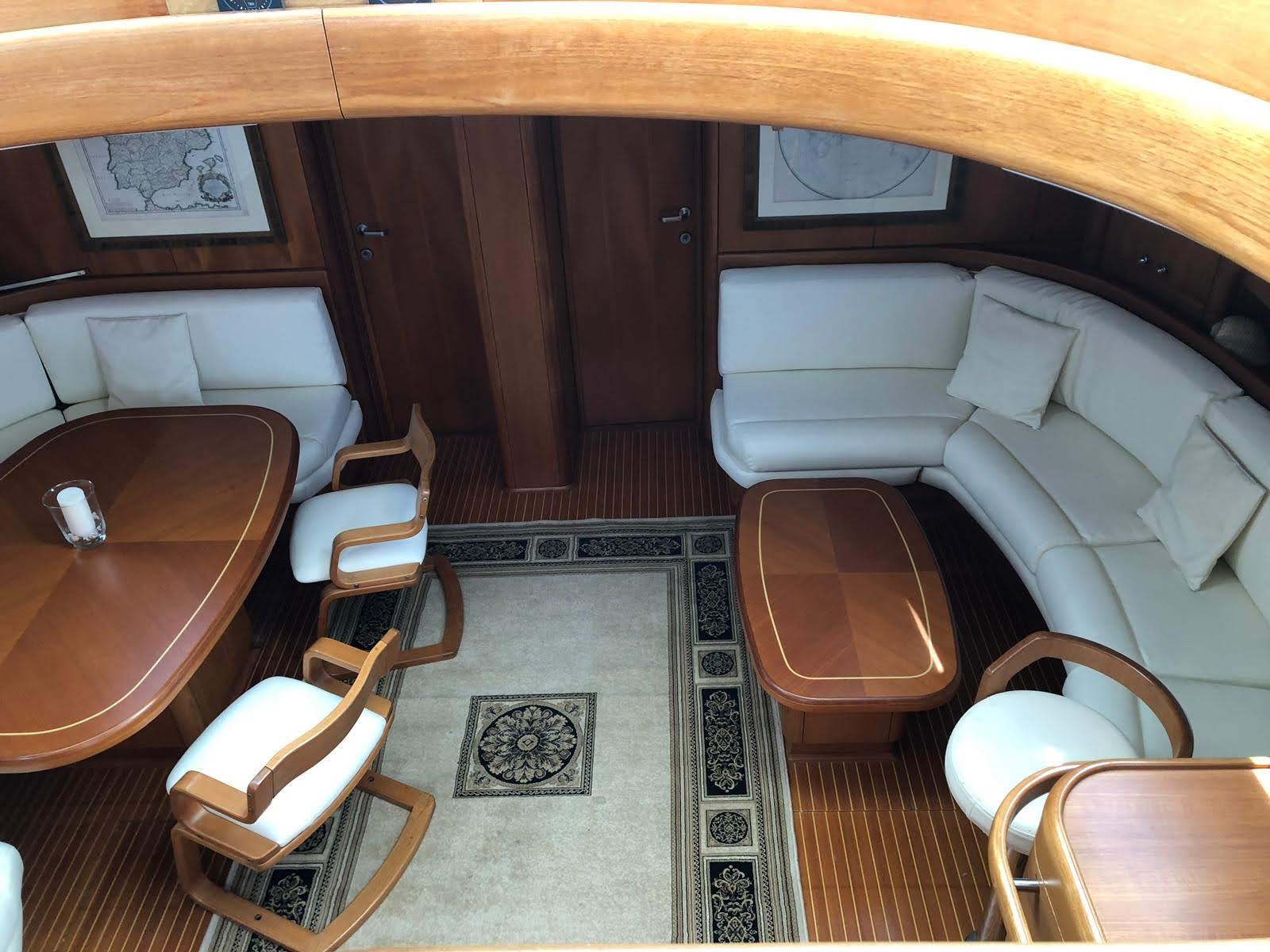 Guests enter through the central steps from the cockpit into the wheelhouse area before descending into the main salon. The open plan space is configured with a lounge and dining setting with the integrated galley tucked in the port side.