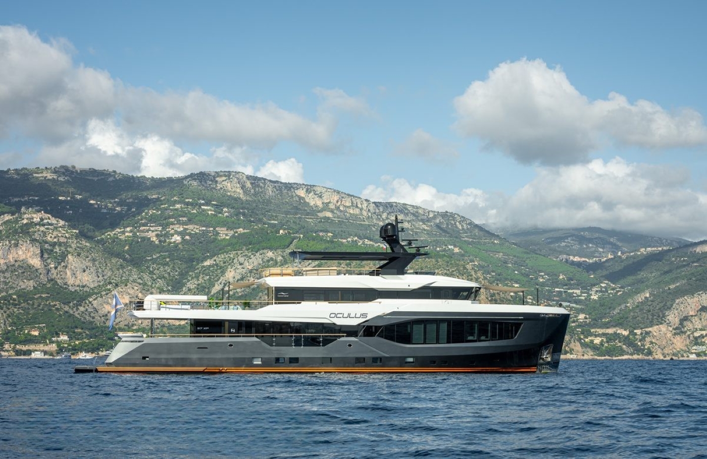 Luxury yacht OCULUS is a 37.30m (122' 5") Numarine tri-deck motor yacht launched in 2024 with impressive profile including a plumb bow, grey hull and explorer yacht looks. The cool interior is from design studio Hot Lab and features a palette of grey neutrals blended with warm wood and marble finishes.