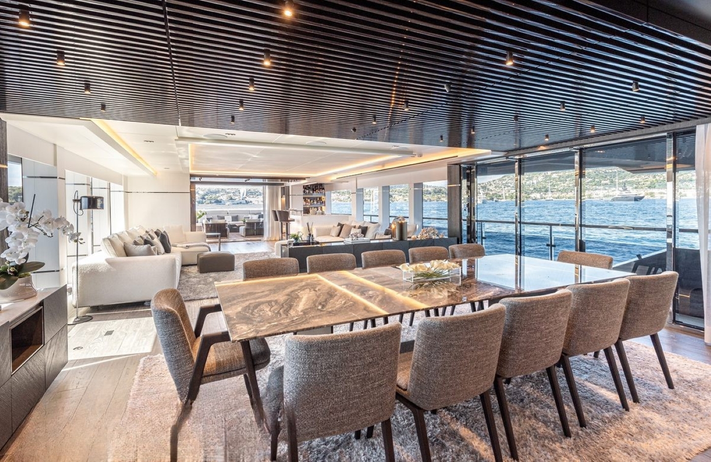 An expansive upper deck aft stores water toys when underway and creates a great guest space when at anchor leading into the sky lounge.