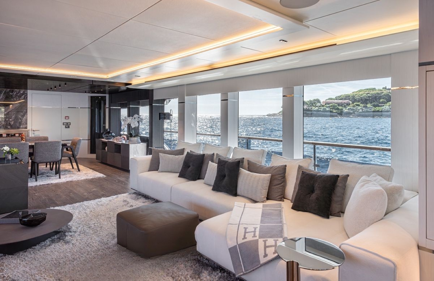 Al fresco dining is available on the main deck aft from where guests have direct access into the main salon and down to the beach club at the water’s edge.
