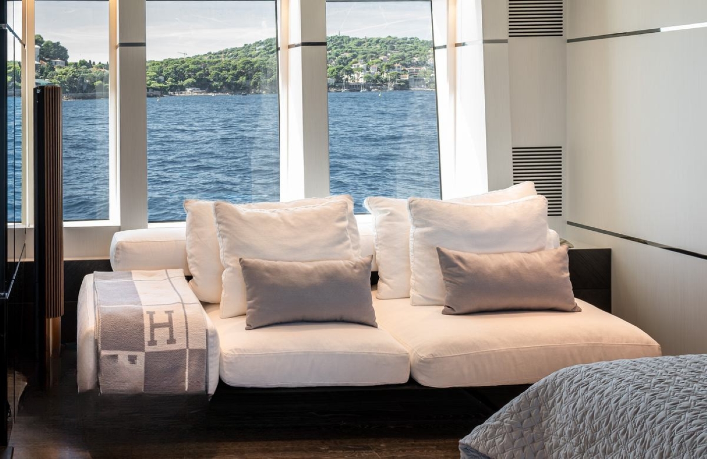The cool interior is from design studio Hot Lab and features a palette of grey neutrals blended with warm wood and marble finishes. Up to twelve guests can be accommodated in six ensuite staterooms with additional cabins for the seven crew members.