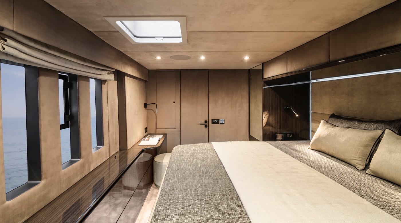 Steps lead down on either side to the water’s edge where a hydraulic central platform gives guests easy access to the water and the water toys. The wide front terrace on the foredeck can be accessed via the companionways or directly from the main salon.