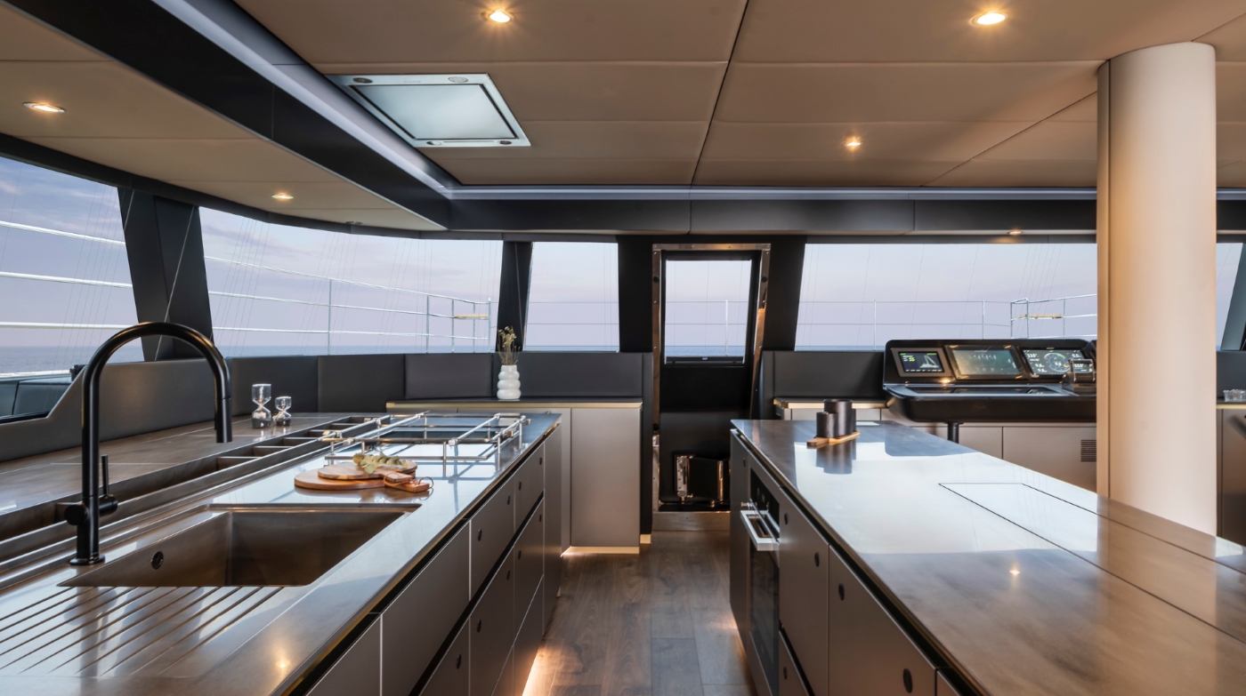 Steps lead down on either side to the water’s edge where a hydraulic central platform gives guests easy access to the water and the water toys. The wide front terrace on the foredeck can be accessed via the companionways or directly from the main salon.