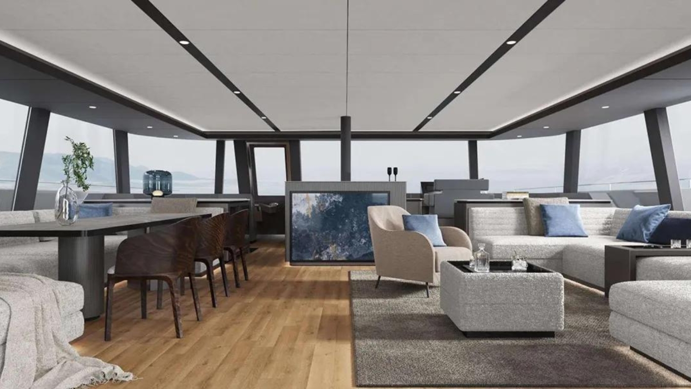 The sun deck is configured with a dining /lounge setting, a sit up bar and sun pads perfect for taking in the surrounding from the 360° views. The wide beam creates a lovely open aft cockpit with steps down to the swim platform and hydraulic central section.