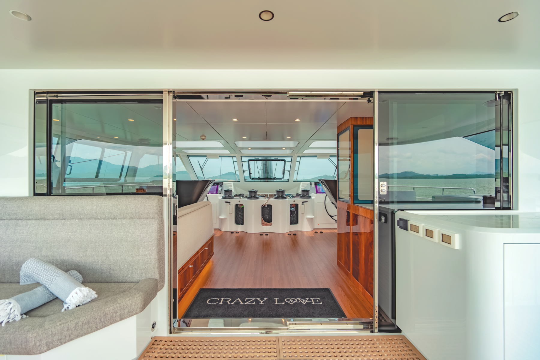 Doors lead into the upper salon which includes a lounge area, helm controls and a useful corner day head.