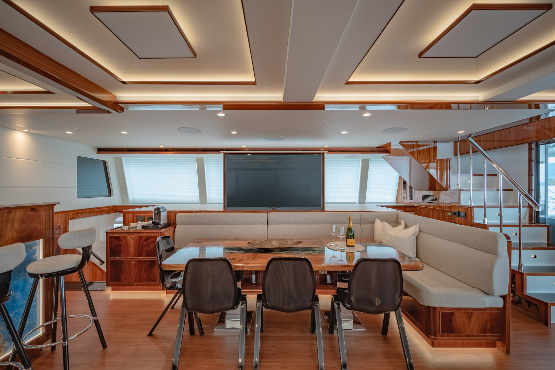 Aft on the flybridge is an open space including a large jacuzzi adjacent adjustable sun pads and a corner dining setting with a beautiful wood and onyx tabletop. Doors lead into the upper salon which includes a lounge area, helm controls and a useful corner day head.