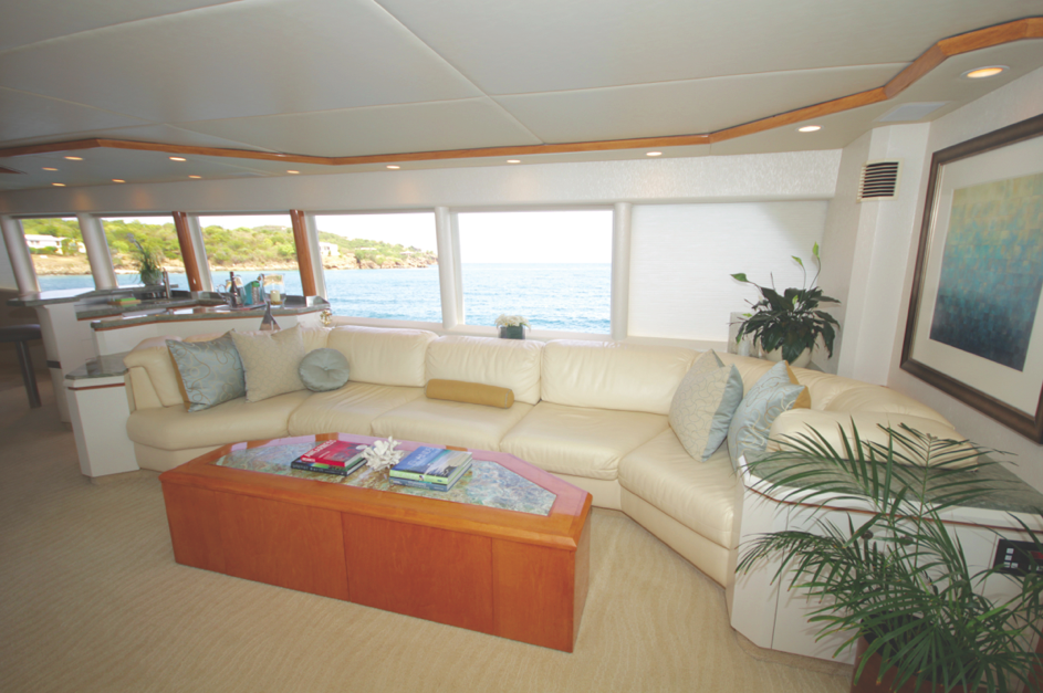 The saloon is adjoined to the formal dining area midship, which can comfortably seat up to ten guests. This area also has custom granite counter tops. Refrigerator, ice maker and Bar stool seating for two.